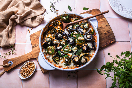 Den Spinat in eine Pfanne geben und bei mittlerer bis hoher Hitze für ein paar Minuten braten. Die Tomatensauce dazugeben und eine Weile köcheln lassen. In der Zwischenzeit die Auberginen und Zucchinis waschen, den Strunk abschneiden und der Länge nach in ca. 0,5 cm dicke Scheiben schneiden. Die Spinat-Tomatensauce in die Auflaufform geben und zur Seite stellen. Den Ofen auf 200°C vorheizen. Die Pfanne kurz auswaschen und nun Öl und Gewürze hineingeben. Die Gemüsestreifen darin bei mittlerer Hitze von beiden Seiten für einige Minuten anbraten, bis sie elastisch sind und sich rollen lassen. Die Aubergine etwas länger anbraten, damit sie später im Ofen schön weich werden kann und auf der Zunge zergeht. Die Gemüsestreifen auf einem Schneidebrett kurz abkühlen lassen. Pro Streifen etwa einen halben Teelöffel Ricotta im vorderen Drittel verstreichen und von Hand zusammenrollen. Die Gemüseröllchen nebeneinander in der Auflaufform verteilen, ggf. mit etwas Mozzarella bestreuen und im Ofen für 30 - 40 Minuten bei 200°C backen. Vor dem Servieren mit Pinienkernen bestreuen.